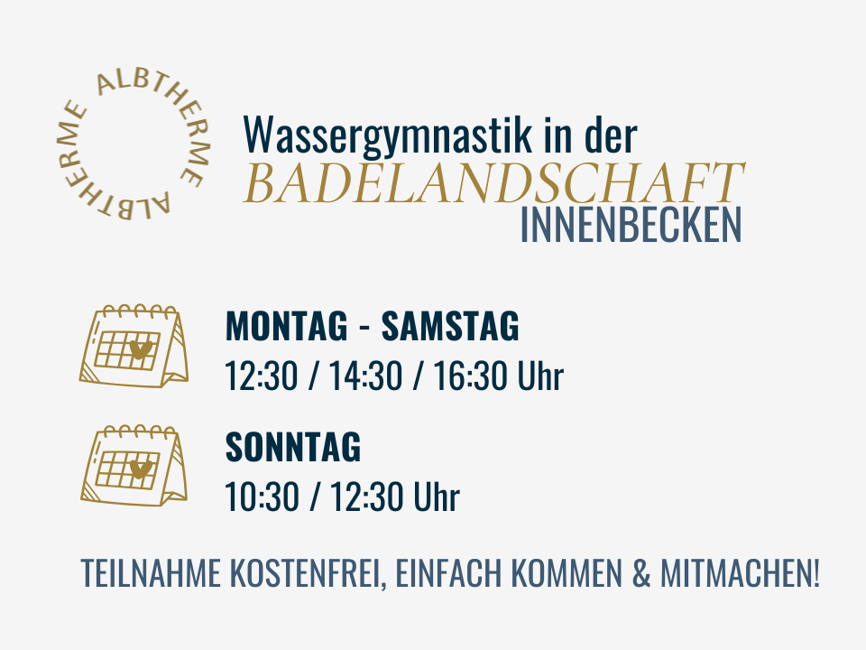 Bouger ensemble dans l'eau chaude de Themal et être actif, c'est ce que nos clients de l'Albtherme peuvent faire lors de notre séance gratuite d'aquagym dans le grand bassin intérieur.